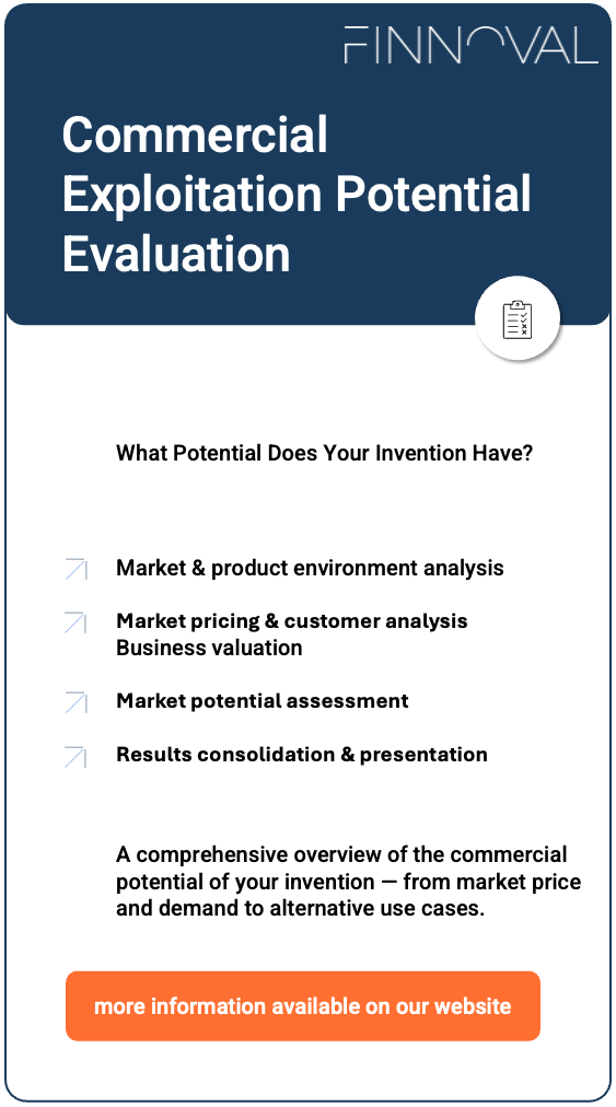 Einen umfassenden Überblick über das kommerzielle Potenzial Ihrer Erfindung – von Marktpreis und Nachfrage bis hin zu alternativen Anwendungsfällen. Wir liefern Ihnen klare wirtschaftliche Indikatoren, eine strukturierte Präsentation und Input für Investorengespräche oder strategische Entscheidungen.