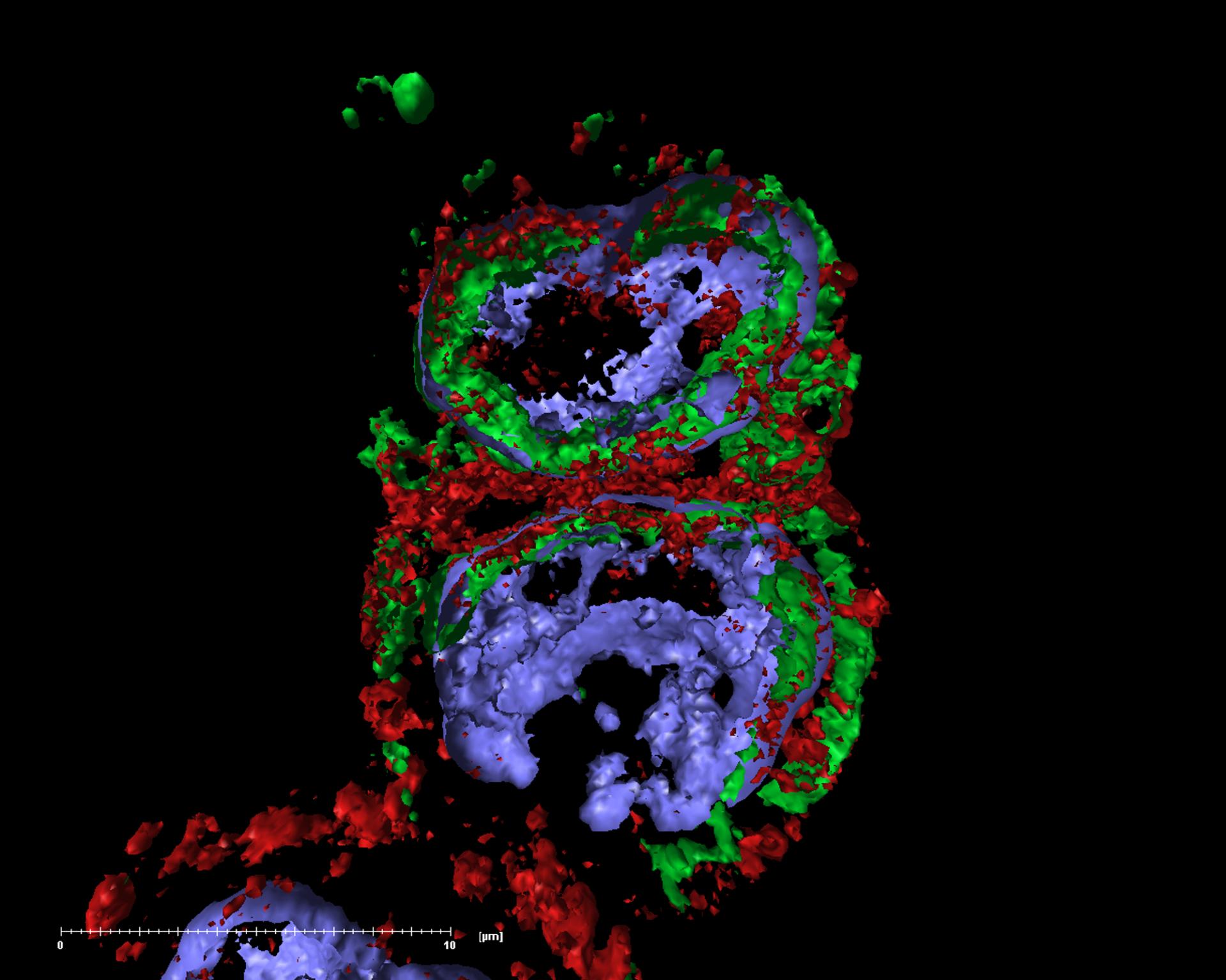Microscope image showing human cells infected with the flu. Image from UCBL1, Lyon. © Inserm/Rosa-Calatrava, Manuel & Ressnikoff, Denis