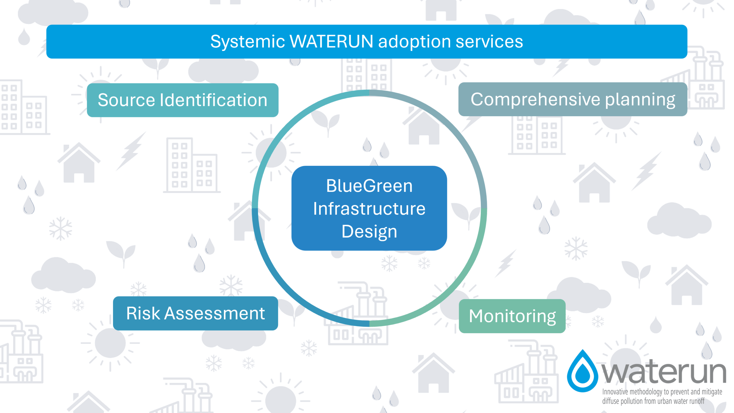 The WATERUN approach to water sensitive urban design combines new, next generation approaches and tools to urban water runoff and management. The WATERUN approach enables urban planning organisations to 1) model and identify potential sources of stormwater pollution, 2) Implement low-cost, rapid monitoring campaigns for prioritization of key areas within a given catchment area, 3) model cost-effective and modular/decentralized applications of blue-green infrastructure, and 4) Establish a stormwater reuse planning and early-warning decision-making system considering public health and environmental risks.