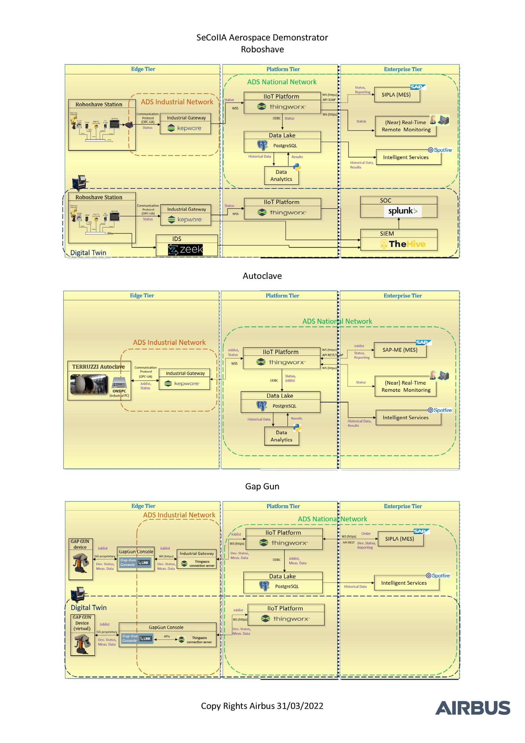 Secure Industrial IoT implementation for Airbus Defence & Space plants of Tablada, San Pablo Sur and Cadiz which assemble civil and military aricraft. The IIoT network embedds three types of systems which are distributed over the different plants: Roboshave is a highly automated rivet shaving system for aircraft rudders, Autoclave is a large industrial oven curing composite parts, Gap Gun is a non-contact laser profilometer that measures gaps and steps in aeronautical parts. The IIoT platform enables to collect, broadcast and exploit machine data as a mean to improve the aircraft manufacturing processes, facilitate control by operators, reduce inaccuracies and quality problems.