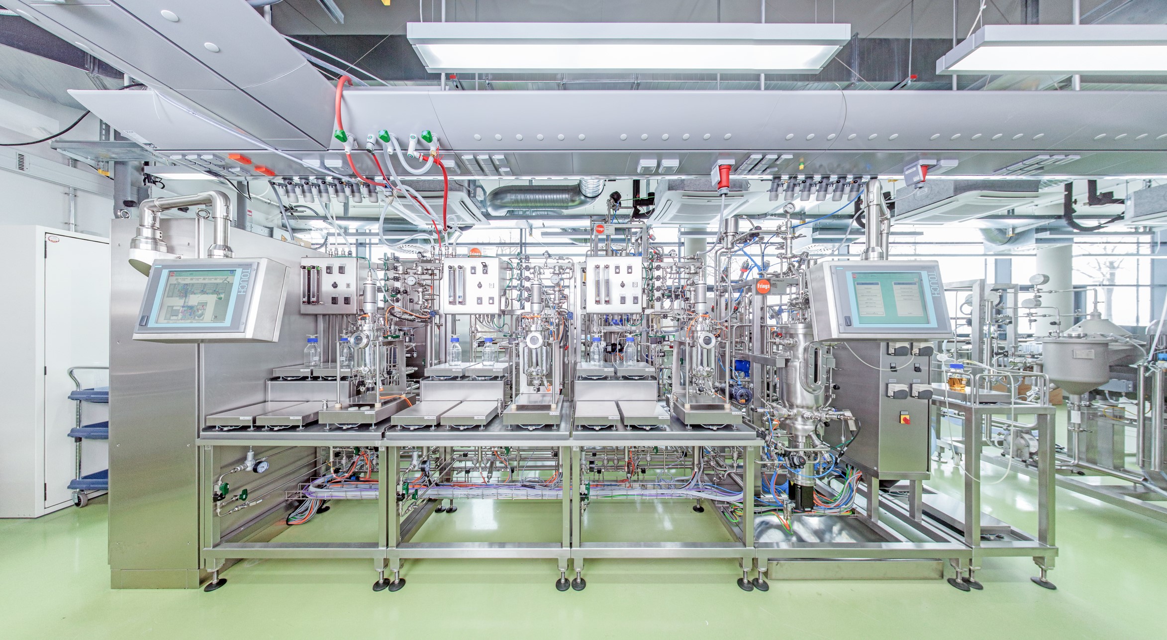 Upstream Processing: S1 pilot plant with stainless steel bioreactors: 3x 2 liter, 1x 10 liter, 1x 100 liter working volume with exhaust gas analytics and process analytics, centrifugal mill for crushing plant substrates, shaking and standing incubators, flow separator for cell separation, autoclaves