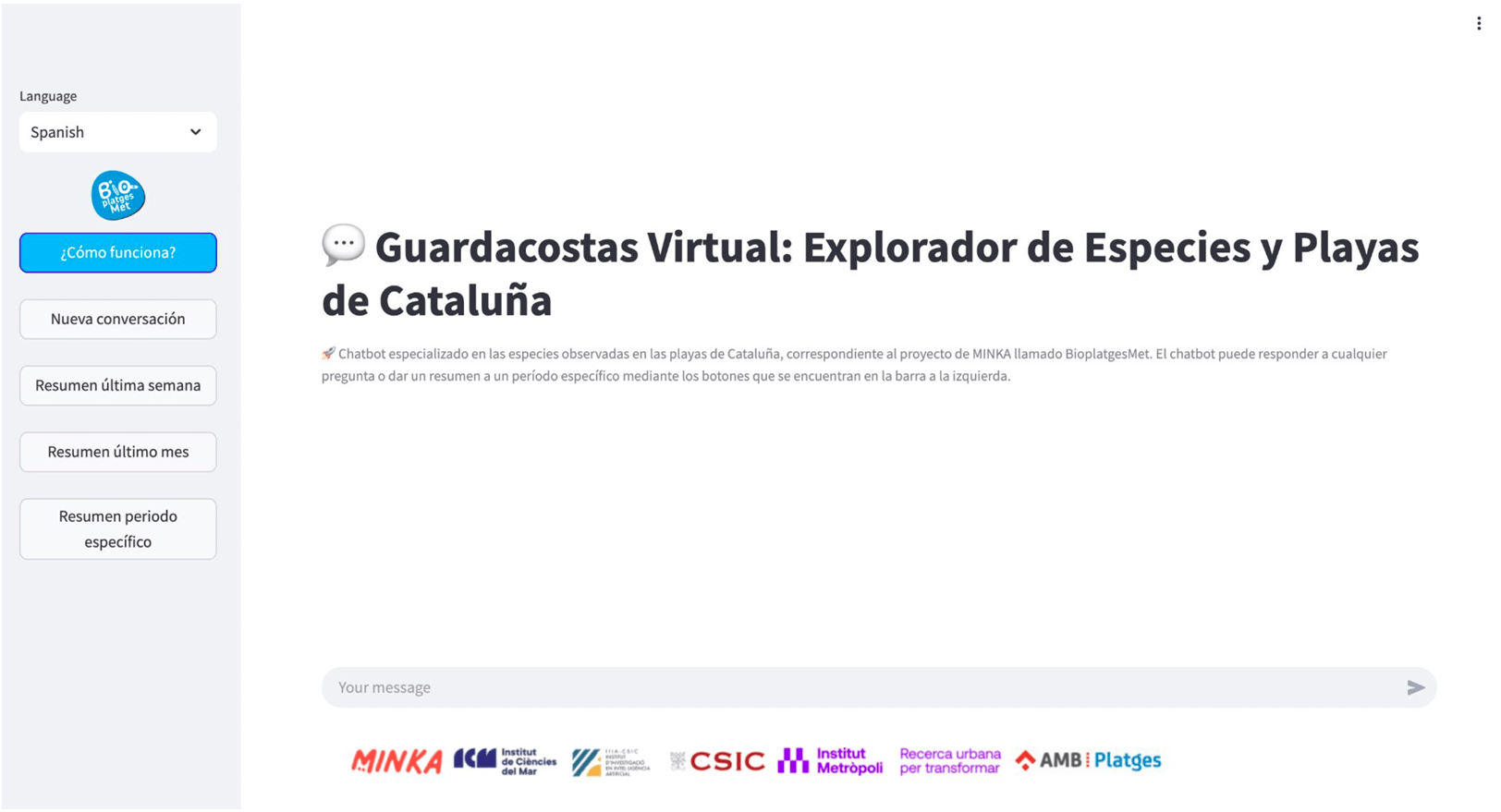 Main features: Guardacostas Virtual is an AI-based chatbot that interacts with citizens and users of beaches in the Barcelona metropolitan area. It provides responses to frequently asked questions and connects users with relevant information about beach management and biodiversity.