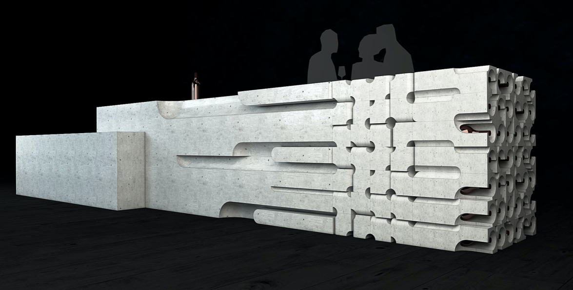 The starting point for the design concept of Wine Cooler by Austrian designer Martina Hatzenbichler was the fusion of two contrary initial forms and materials. The volume of a raw and unfinished monolithic body is broken up here through the circular segments of the organic form of a glass bottle in order to create openings. The outlines and edges are extended as they respond to one another. Turning and stacking the individual elements offers a multitude of possible combinations. This results in an entirely new overall structure, with the Wine Cooler turning into a wine shelf or even into wine architecture.