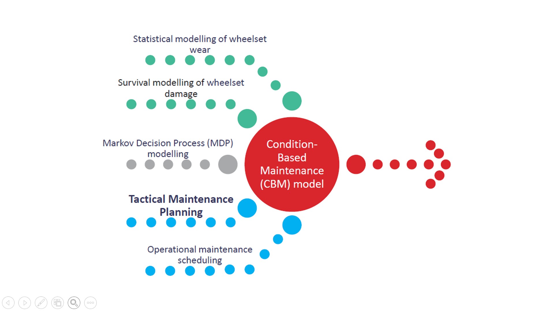 A range of techniques have been combined to develop a condition-based maintenance (CBM) model for railway wheelsets. This model supports maintenance decisions and optimisation of wheelset maintenance activities and has been demonstrated to provide a business and financial benefit.