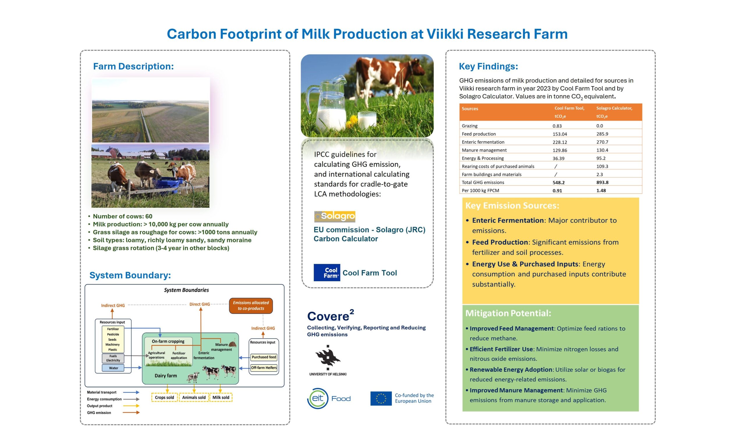 COVERE² stands for collecting, verification, reducing and reporting greenhouse gases. COVERE² is a combination of consultancy services, tools and technology solutions. LCA of milk production provides COVERE2 with a comprehensive case study and benchmark, ultimately enhancing the quality and transferability of its services. LCA was conducted at the Viikki Research Farm in Finland to determine the carbon footprint of milk production and identify mitigation strategies. Data collected over two years (2022-2023) were analyzed using two carbon footprint calculators: Solagro and Cool Farm Tool. Improving feed efficiency, N fertilizer adjustments, better manure management, and renewable energy adoption showed promise in reducing the CF of milk production.
