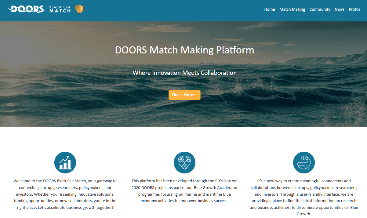 The DOORS Matchmaking Platform is an interactive digital solution developed to support stakeholder collaboration and foster innovation within the Black Sea Blue Economy. It enables researchers, businesses, and investors to connect, communicate, and form partnerships aligned with sustainable blue growth. The platform features profile creation, targeted partner search, discussion forums, and direct messaging. This user-centric tool supports long-term networking, project development, and regional integration in the marine and maritime sectors. It includes advanced search and filtering functionalities that allow users to find potential partners based on specific needs and interests. Once a match is identified, users can initiate contact through a secure internal messaging system that respects privacy while encouraging direct dialogue. It offers a dedicated space for ongoing discussions, where users can exchange insights, explore opportunities, and contribute to a collaborative community. The platform supports meaningful networking, cross-sector collaboration, and regional integration in marine and maritime innovation, as it has been designed with usability and long-term impact in mind.