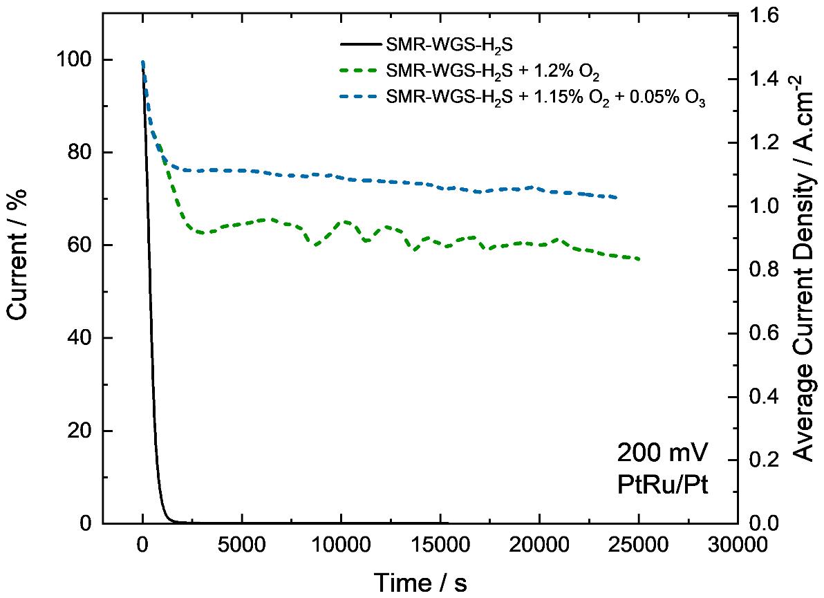 The poison mitigation strategies considered worked well to increase the operation time and efficiency of the EHP when operating with impure feeds. For the all-inclusive H2 feed stream considered, the SMR-WGS-H2S H2 feed (78.6% H2, 18.5% CO2, 2.9% CH4, 20 ppm CO and 100 ppb H2S), the EHP would completely poison in less than 1 hr. However, with the addition of the 1.15% O2 + 0.05% O3 bleed, the EHP can now operate with a current density of ~73% (~1.1 A.cm-2) of the current density with a pure H2 feed.