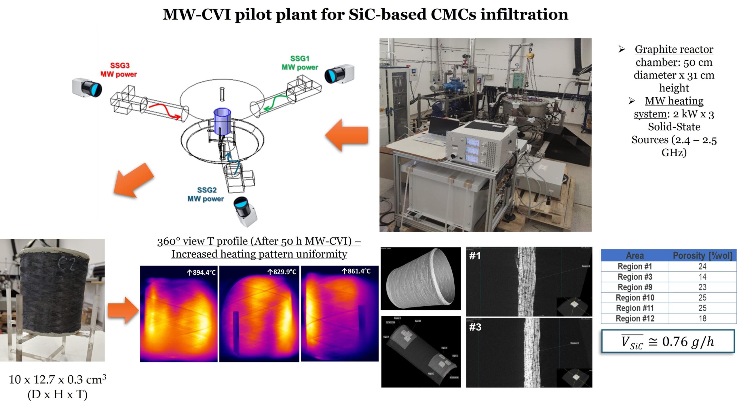 A customized approach enabling the scalability of the Microwave-assisted Chemical Vapor Infiltration (MW-CVI) technology for the production of a SiCf/SiC tube having a diameter of 10 cm, height of 12.7 cm, wall thickness of 0.3 cm, by means of a reactor enabling a multiport and multifrequency excitation around 2.45 GHz, was developed. Comprehensive rigorous numerical modelling of the MW-CVI loaded reactor allowed to reliably identify the optimal frequencies combination, maximizing the process energy efficiency and heating pattern uniformity. A total MW power of 4.5 – 5 kW was distributed among the three available excitation ports, achieving an unprecedented uniformity in the temperature profile of the CMC tube, in the operating temperature range of 800°C – 1000°C. The obtained results pave the way for a wider and more efficient application of MW-assisted processes in high-temperature industrial applications, contributing to the development of alternative greener technologies.