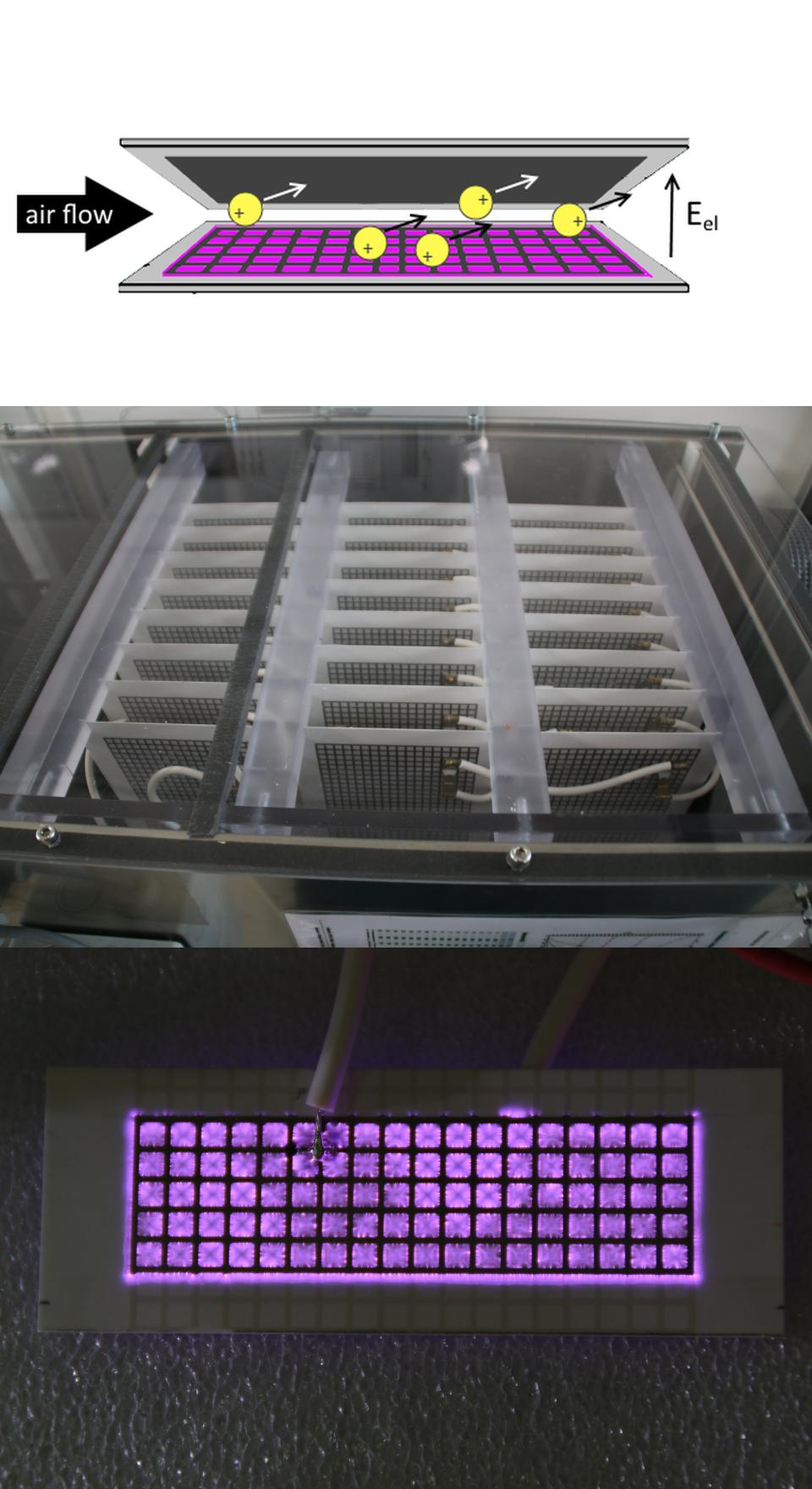 The Ion Wind DBD uses a flat plasma electrode to create a surface dielectric barrier discharge (DBD) in the room air flowing over it. An additional “extraction” electrode is arranged in parallel to form a rectangular ventilation duct. The extraction electrode is charged, so that an additional unipolar electric field through the ventilation duct is created. This drags the ions of one polarity (either positive or negative) generated by the surface DBD in the direction of the extraction electrode. These accelerated ions collide with neutral molecules and particles to form an “ion wind”. In this way, the Ion Wind DBD can remove particles, aerosols or microorganisms from an air stream (similar to an electro filter). Besides that, reactive chemical species generated by the surface DBD can more effectively enter the air volume above thereby enhancing the plasma chemical effectivity.