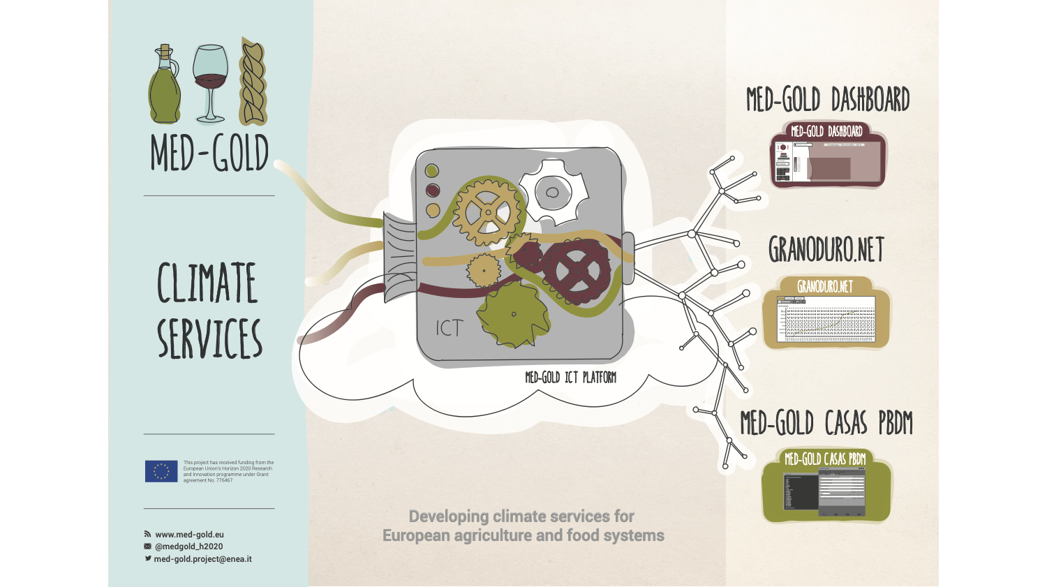 Climate services for the agri-food sector will contribute to making European agriculture and food systems more resilient, sustainable, and efficient in the face of climate change. MED-GOLD has co-developed climate services with users, employing state-of-the-art climate data, either building on existing tools with a high reputation in the respective sectors or creating new tools from scratch. The services rest on the MED-GOLD ICT platform, which is now at an advanced development level and can be replicated over wider geographical areas and in other sectors.
