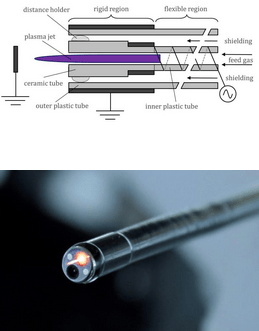 The Miniaturized Noble Gas Plasma Jet has originally been designed to be inserted into the working channel of a conventional endoscope. It has a tube-like character, is flexible, very thin and generates a biologically active jet plasma at the gas outlet. The device consists of an inner plastic tube, a ceramic nozzle, an outer plastic tube and a metal wire. The inner plastic tube is plugged upon the thin end of the ceramic nozzle. In order to provide high voltage at the end of the tube and at the same time maintain tube flexibility the metal wire is coiled around the inner tube. The outer plastic tube is placed coaxially over the inner tube. Thus, two gas channels are created. Through the inner tube helium or neon feed gas is provided with moderate flow rates of up to 300 sccm. The resulting gap between the inner and the outer tube is used to bring a second gas (CO₂) to the gas nozzle that acts as shielding gas. Due to the use of feed and shielding gas a stable plasma jet is generated even in hollow bodies. The original development was funded by the German Federal Ministry of Education and Research (BMBF) under the grant numbers: 13GW0052C and 03Z22DN12.