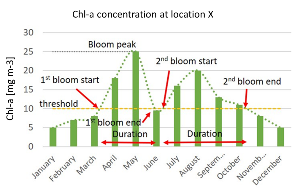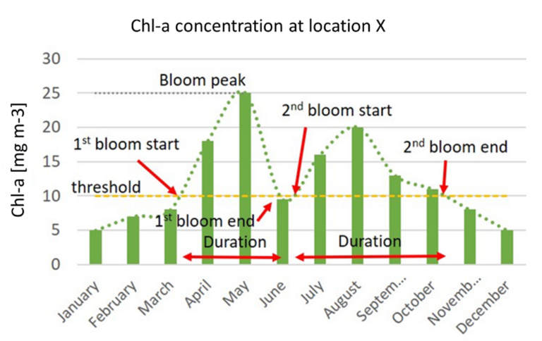 CoastObs offers yearly information to ecologist and (inter) national water management agencies. The following phenology metrics for the dominant phytoplankton bloom can be created: