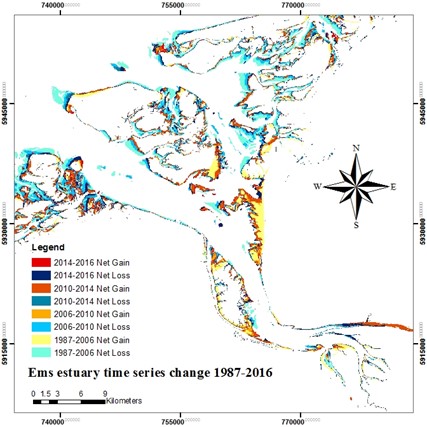 Coastal and especially estuarine environments are characterized by high sediment dynamics. The distribution of sediments over an area will change depending on discrete events (high river run-off, spring-tides) or gradual events (such as sea level rise) resulting in changes in coastline. Erosion will occur in high flow conditions and accretion in the opposite situation. A typical example of a dynamical coastal system with continuous coastline changes is a bird foot delta. Monitoring changes is important for local risk assessment and shoreline management by local, national or international governmental organisations.