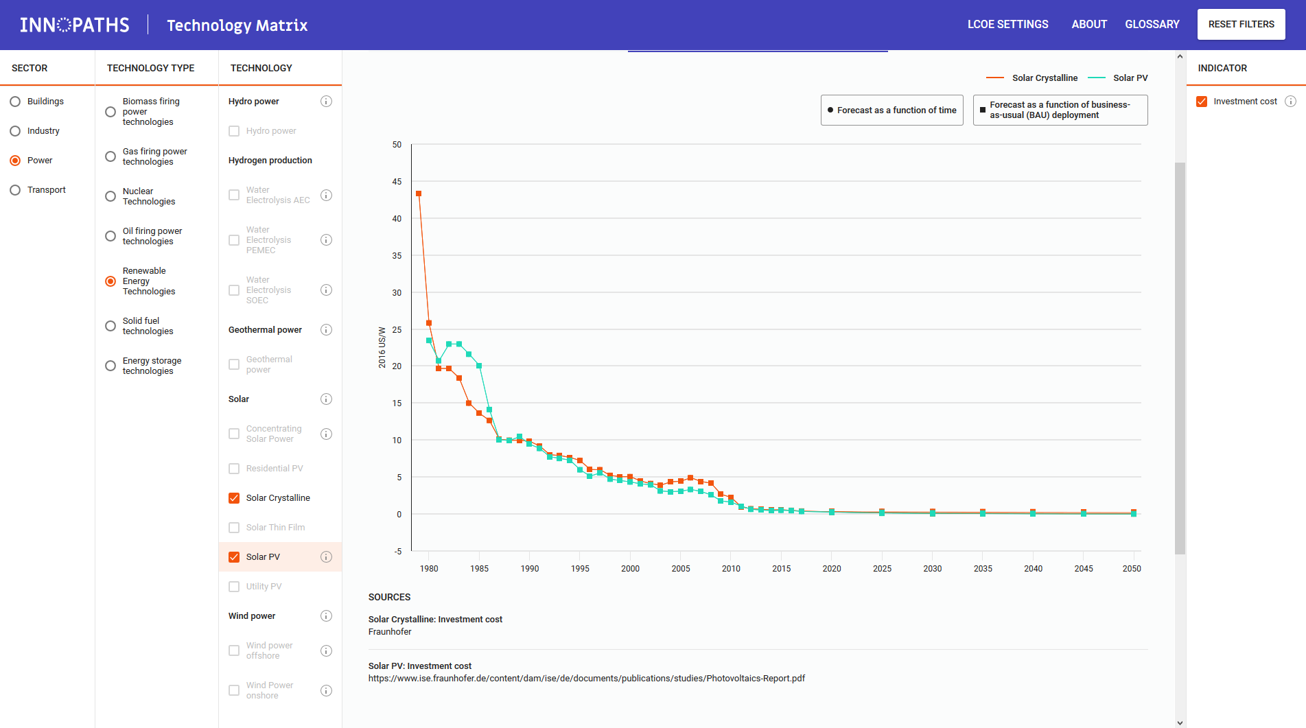 The TMT online tool is an integrated, visual, interactive, and open online platform to be used by policy makers, industry representatives, scientists, and the general public across Europe and globally. The online tool provides information on present and future values of technology costs and performance. The tool integrates information from influential integrated assessment modelling scenarios, learning curve projections, and expert elicitations through to 2050 and beyond. The TMT covers over 20 key energy technologies spanning four key sectors (power, transport, industry and buildings). TMT also includes information on the uncertainty around future costs of a set of those technologies for which additional information is available. In addition, the tool includes a lightweight Levelized Cost of Energy (LCOE) calculator.