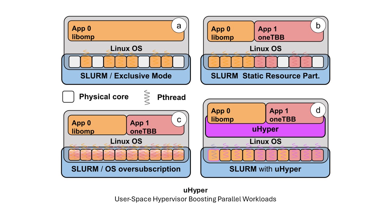 uHyper is a workload-aware, user-space hypervisor that eliminates performance interference when parallel applications share HPC nodes. Developed and validated in the EUPILOT project (TRL 4), the stack unifies: (i) the nOS-V threading system integrated with the LLVM OpenMP runtime for seameless execution of OpenMP applications; (ii) an optimised Task-Aware MPI (TAMPI) library for optimized intra-node communications; (iii) a task-aware glibc that re-implements POSIX pthreads on nOS-V for drop-in adoption on parallel applications using pthreads API; and (iv) a novel Linux syscall that accelerates context switches by an order of magnitude. By reconciling kernel and runtime decisions in user space, uHyper mitigates “OS noise”, prevents oversubscription, and delivers predictable, energy-efficient execution on x86 and Risc-V multi-cores. Benchmarks on representative HPC workloads show better time-to-solution without any application code changes.
