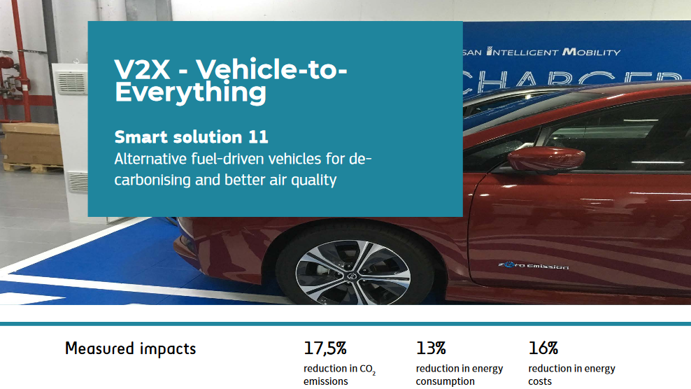 Within GrowSmarter, this measure was deployed at Nissan’s headquarters in Barcelona and focuses on the integration of V2B (Vehicle-to-Building) services with on-site renewable energy generation and energy storage systems in the building. This was done with the installation of two V2X chargers, a photovoltaic plant and an energy storage system.